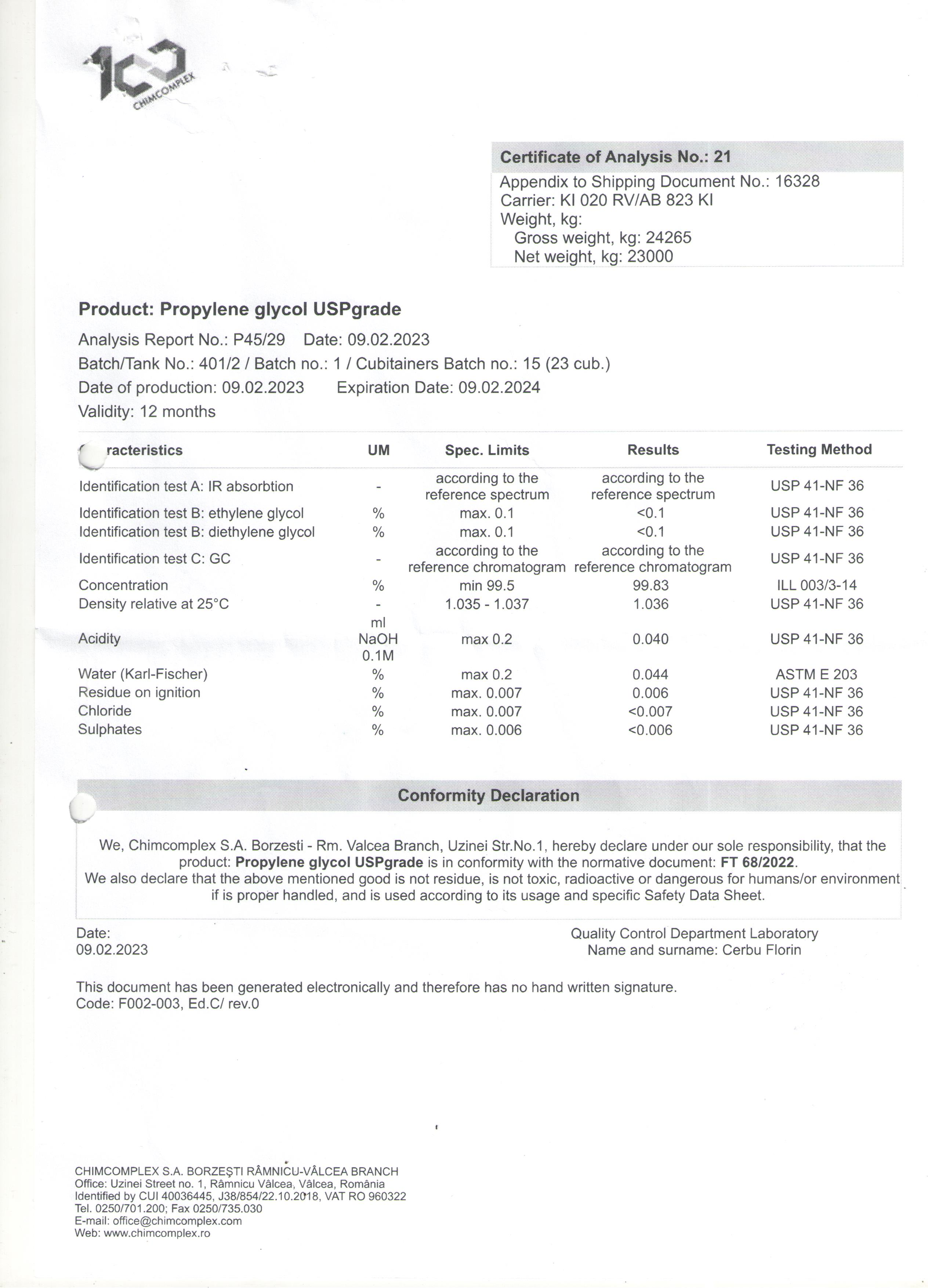 • Kod nas možete kupiti propilen glikol u pakovanjima od 1 litar, 1x2 i 1x4 litra, 5, 10, 25 i 50 litara;